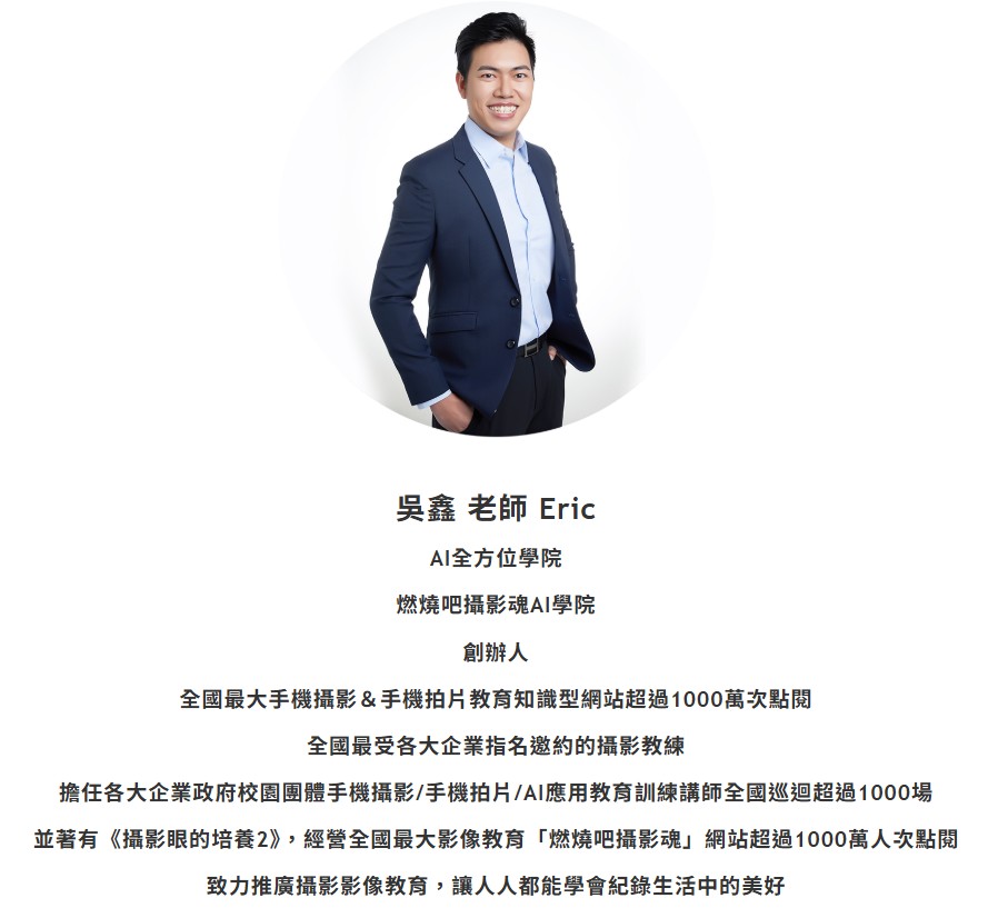 講師:燃燒吧攝影魂AI學院創辦人 吳鑫